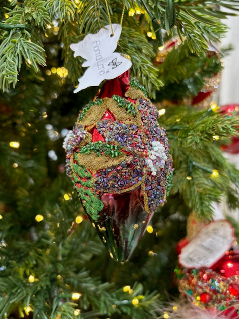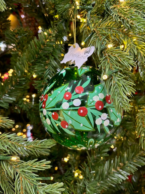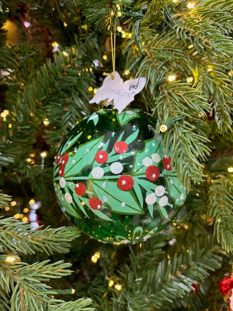 Fiori di lena addobbo in vetro sfera con agrifoglio 12 cm
