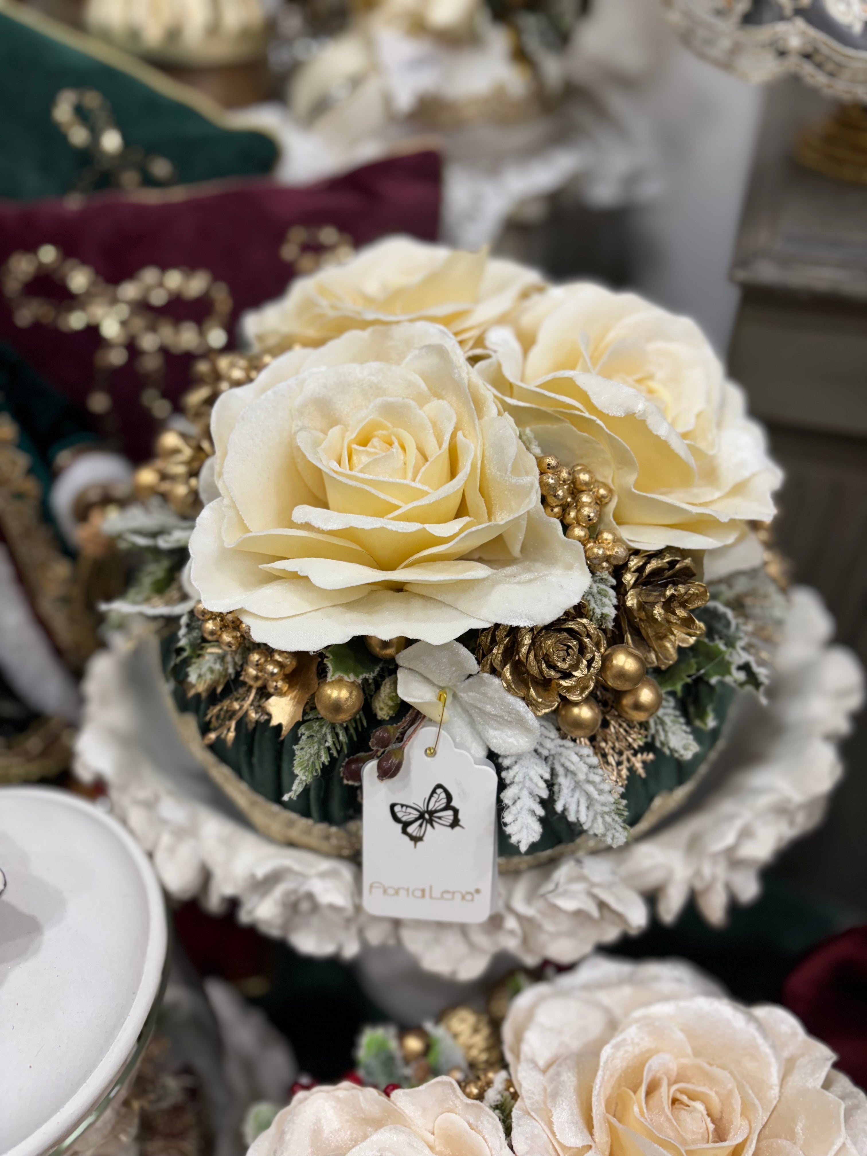 Fiori di lena Pouf profumato verde inglese con 4 rose Linea Dono Prezioso