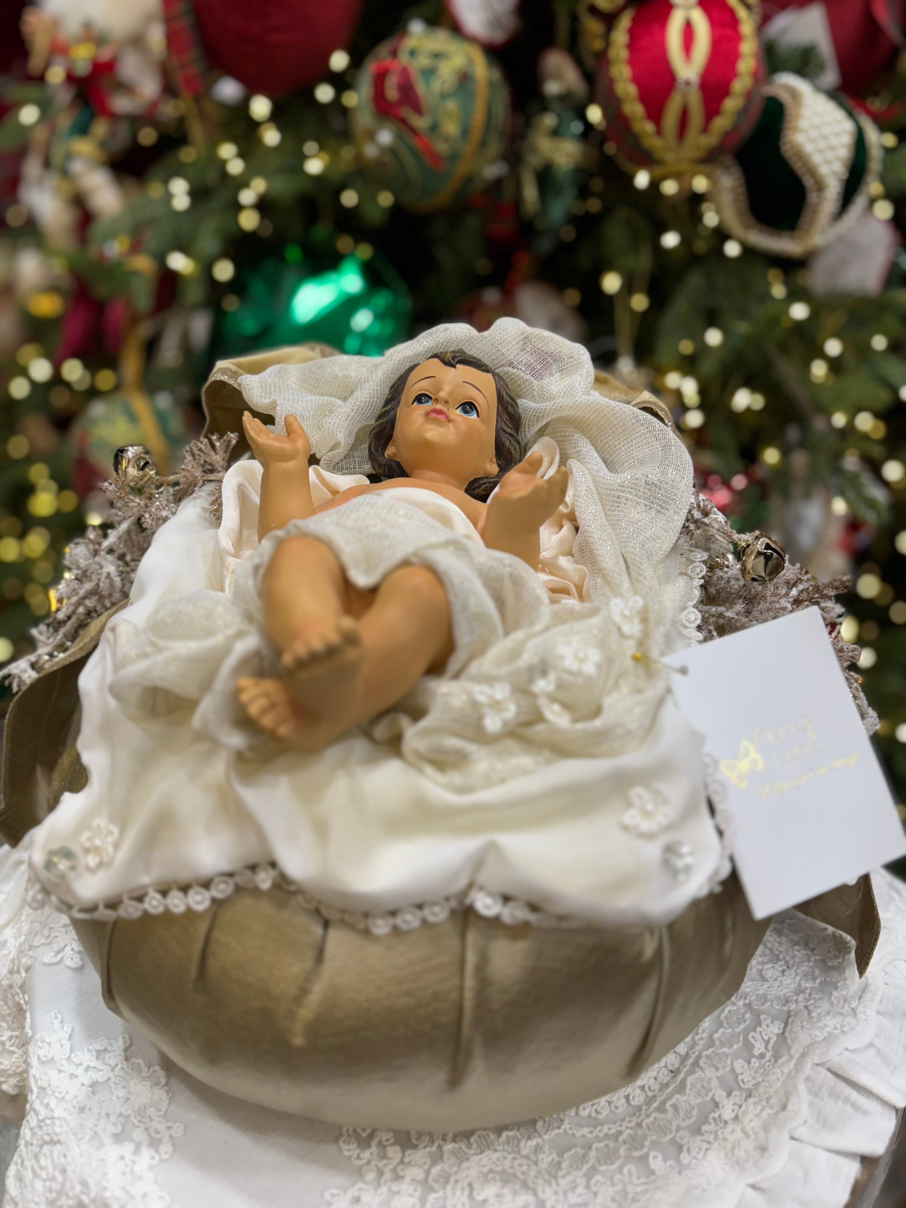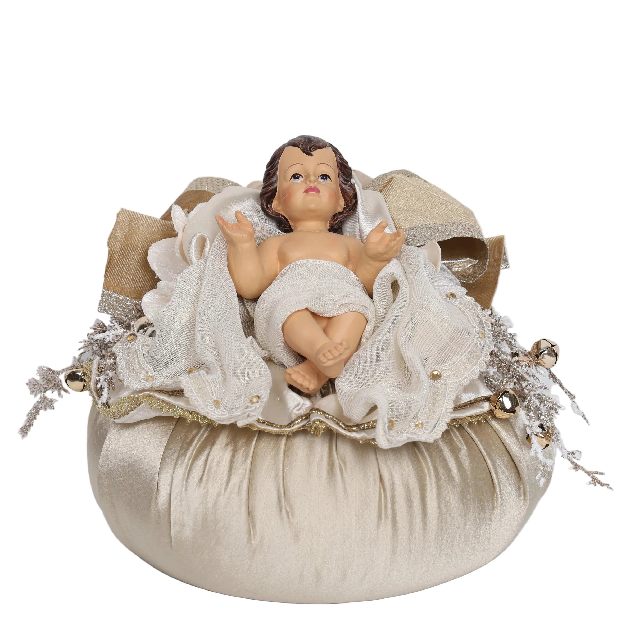 Fiori di lena Pouf Natalizio in Seta con Bambinello e Campanelle
