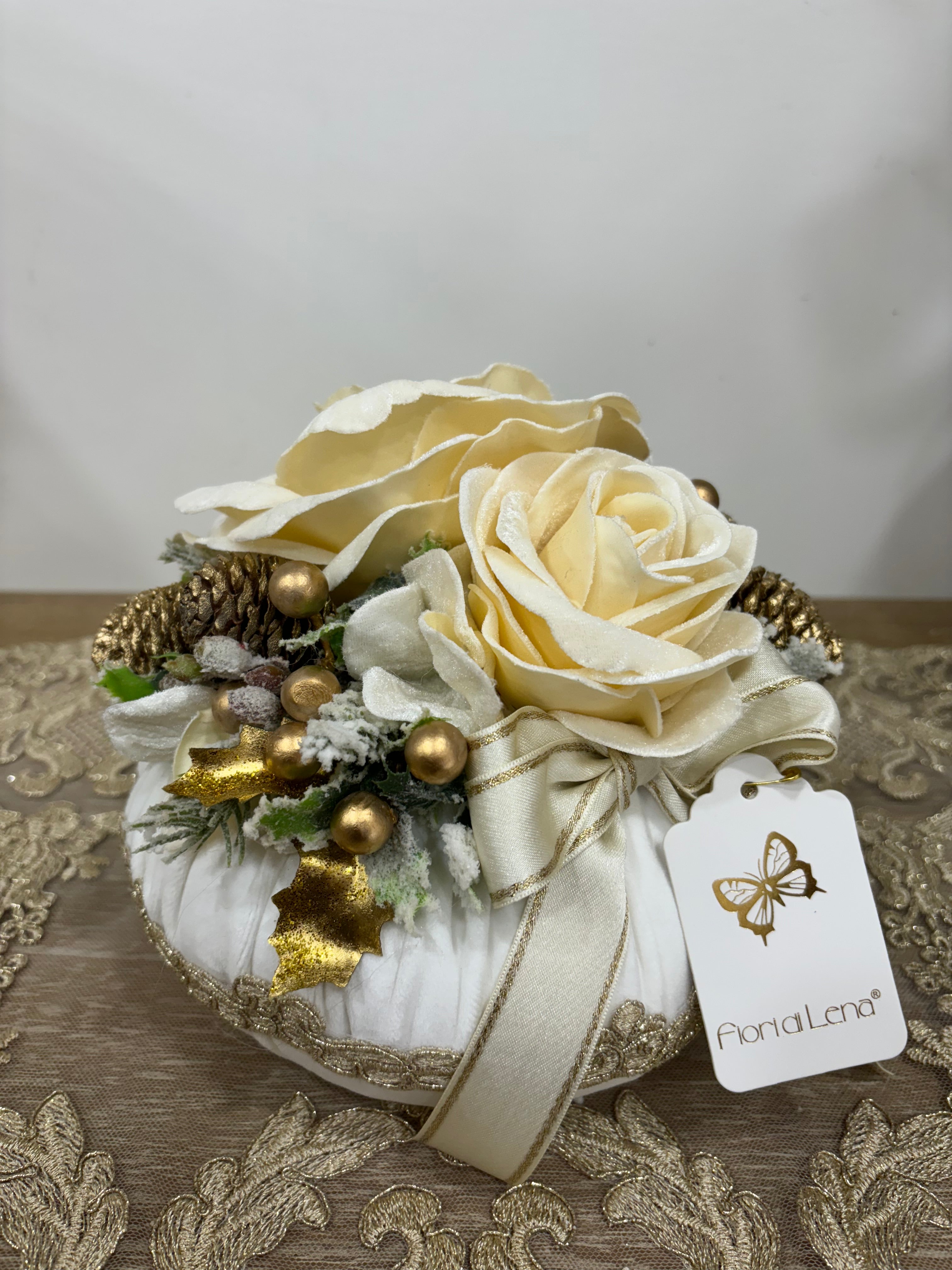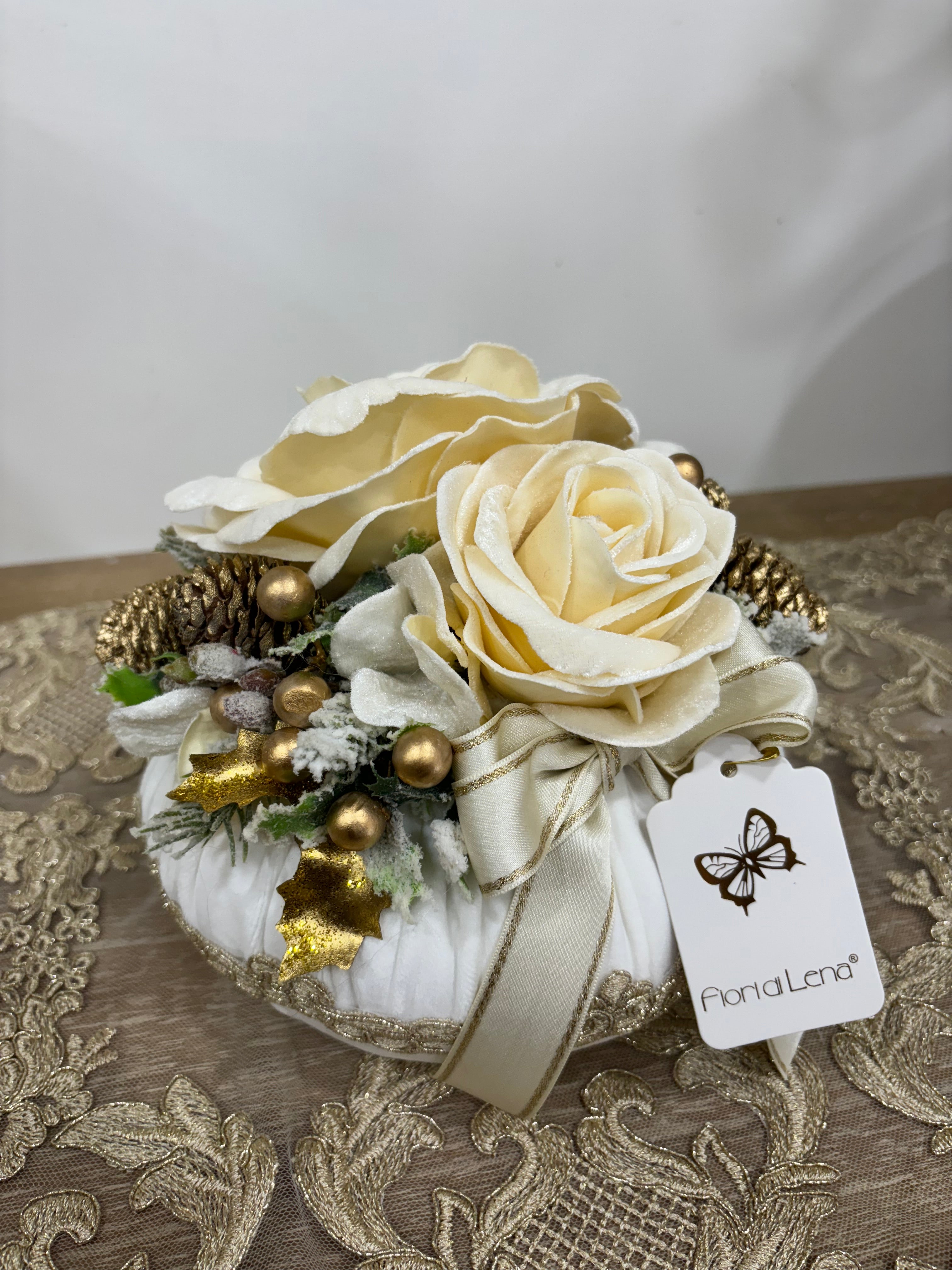 FIORI DI LENA PUFFO IN VELLUTO NOCCIOLA CON 2 ROSE ED ELEMENTI NATALIZI