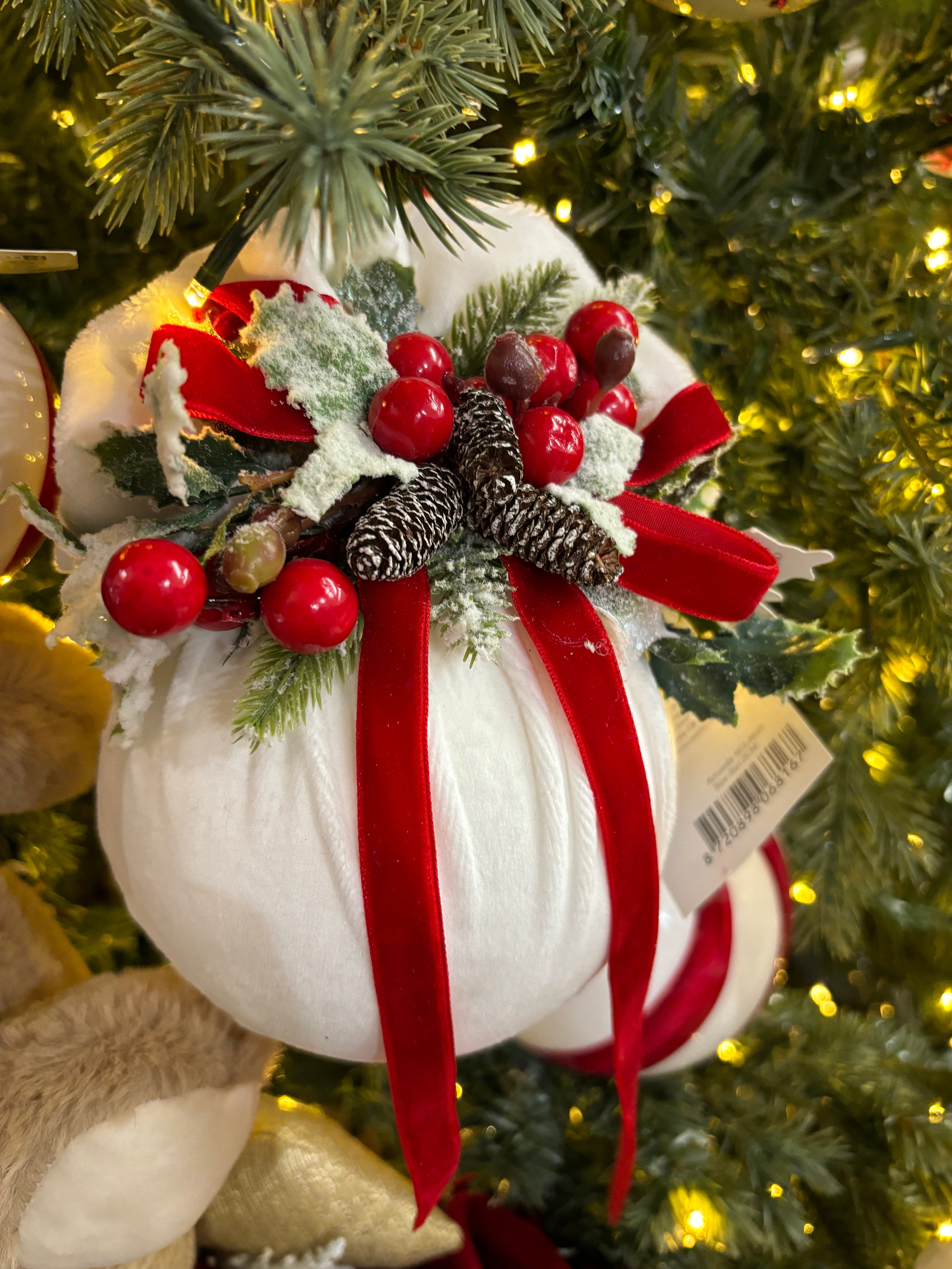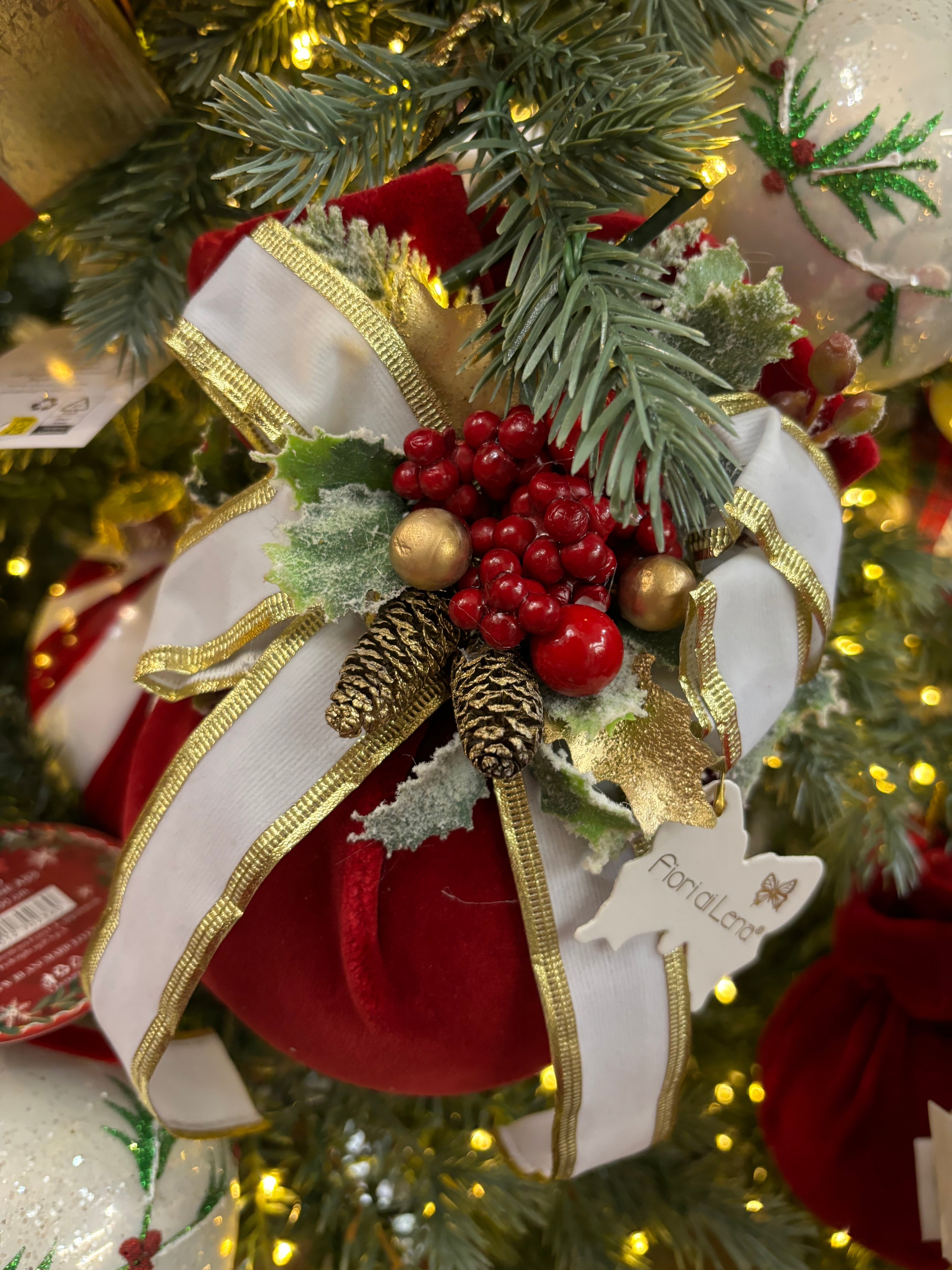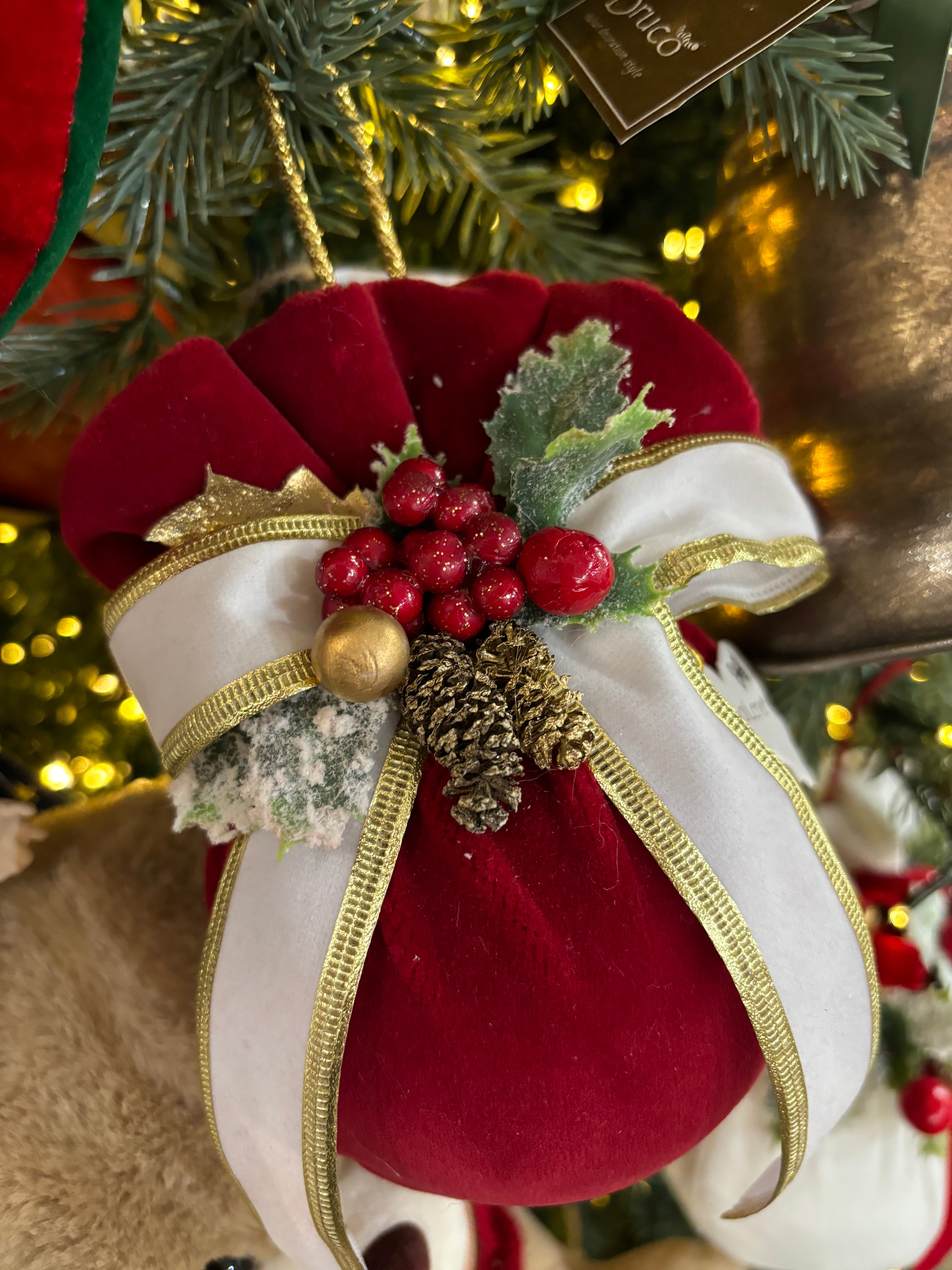 FIORI DI LENA SFERA DA APPENDERE 12 cm VELLUTO BIANCO E NASTRI ROSSI