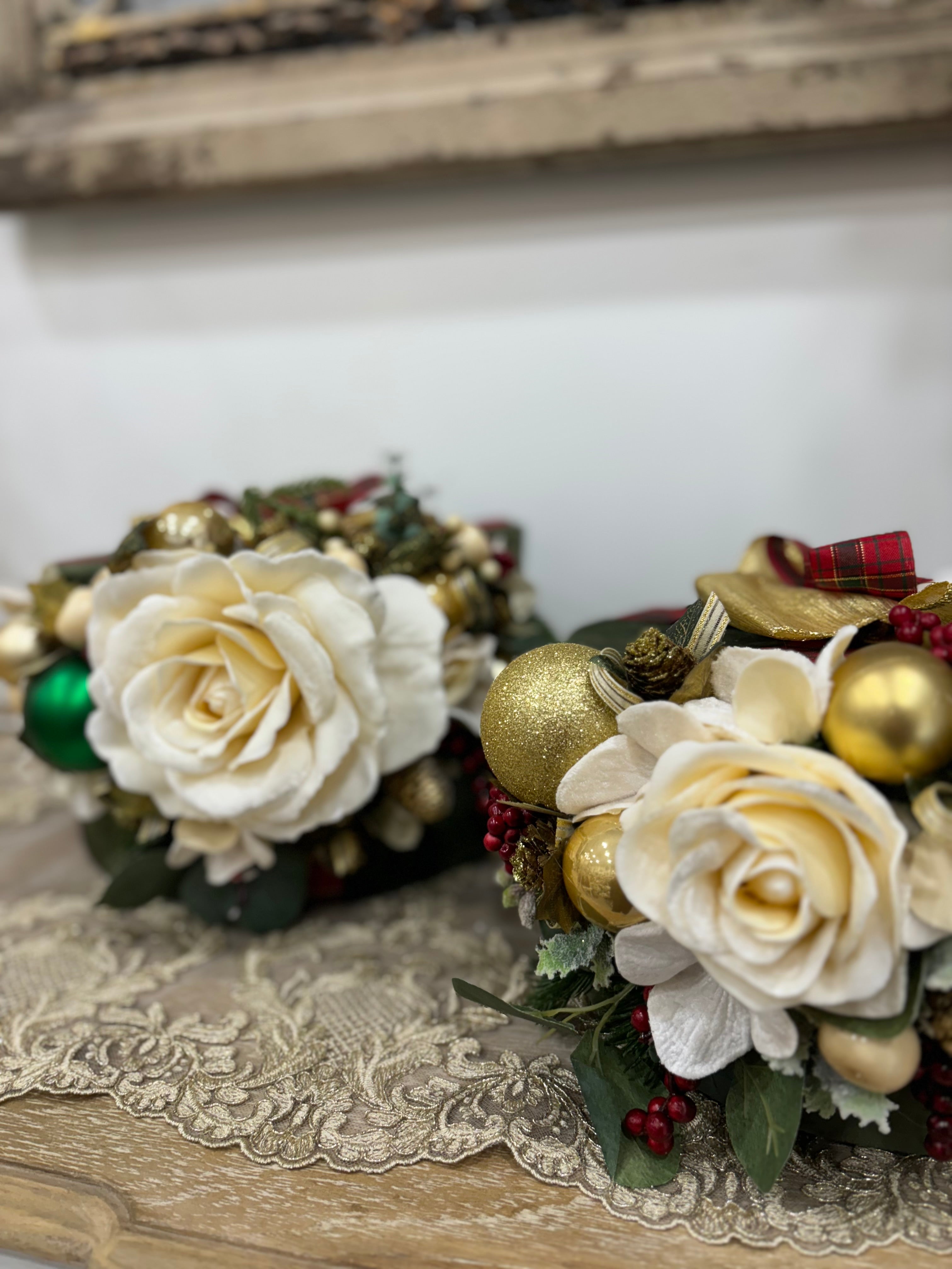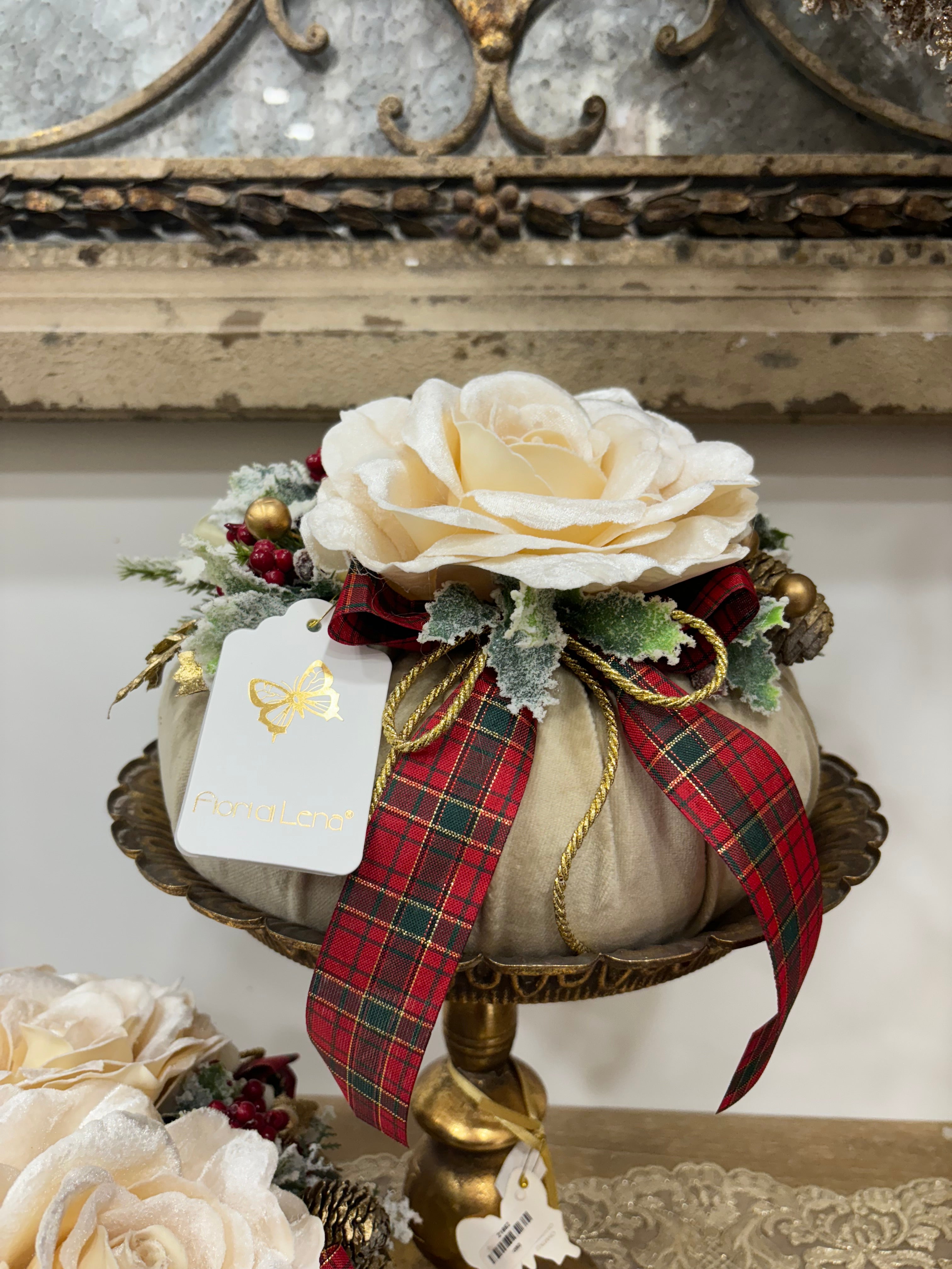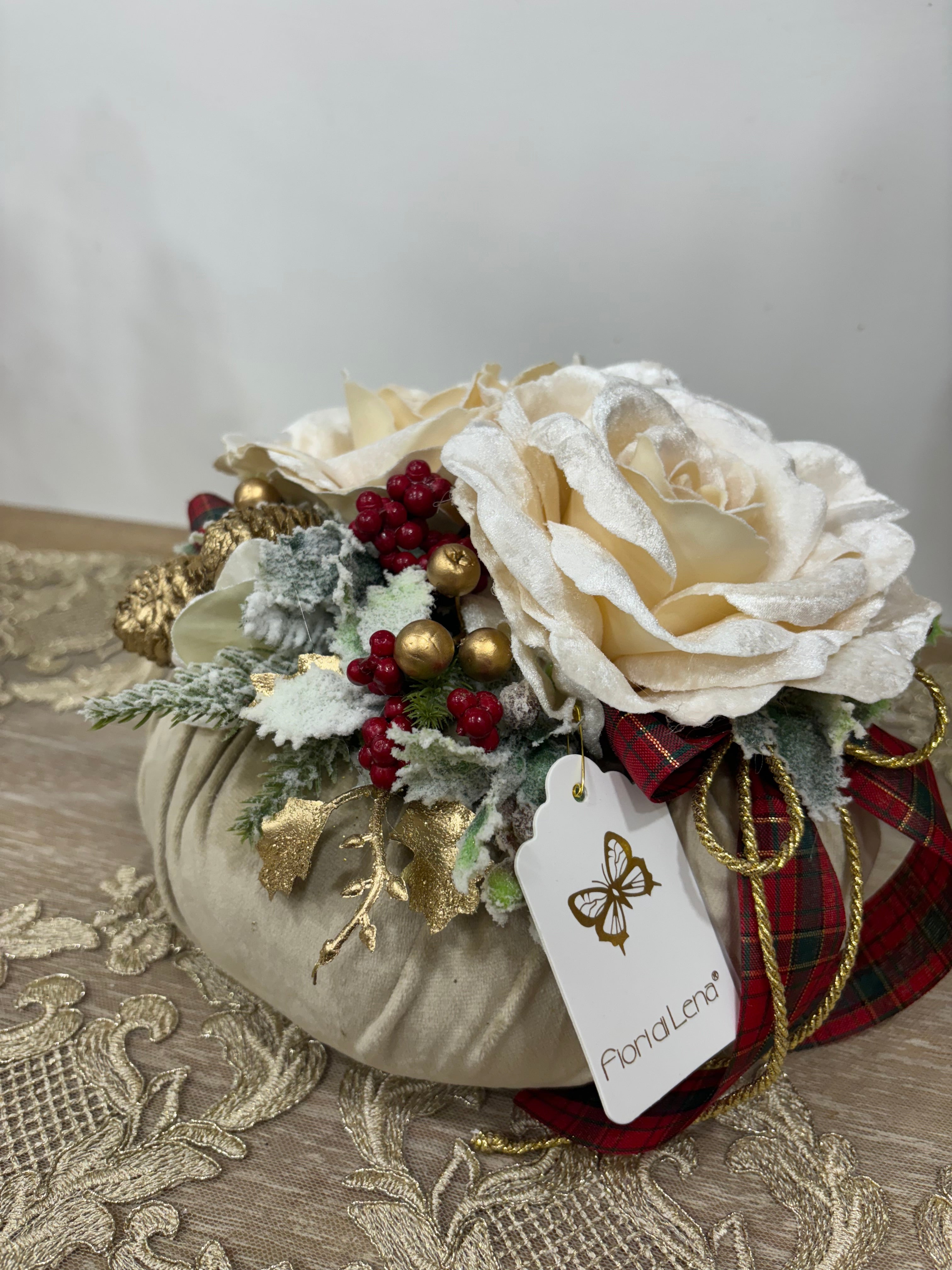 FIORI DI LENA PUFFO IN VELLUTO NOCCIOLA CON 2 ROSE ED ELEMENTI NATALIZI