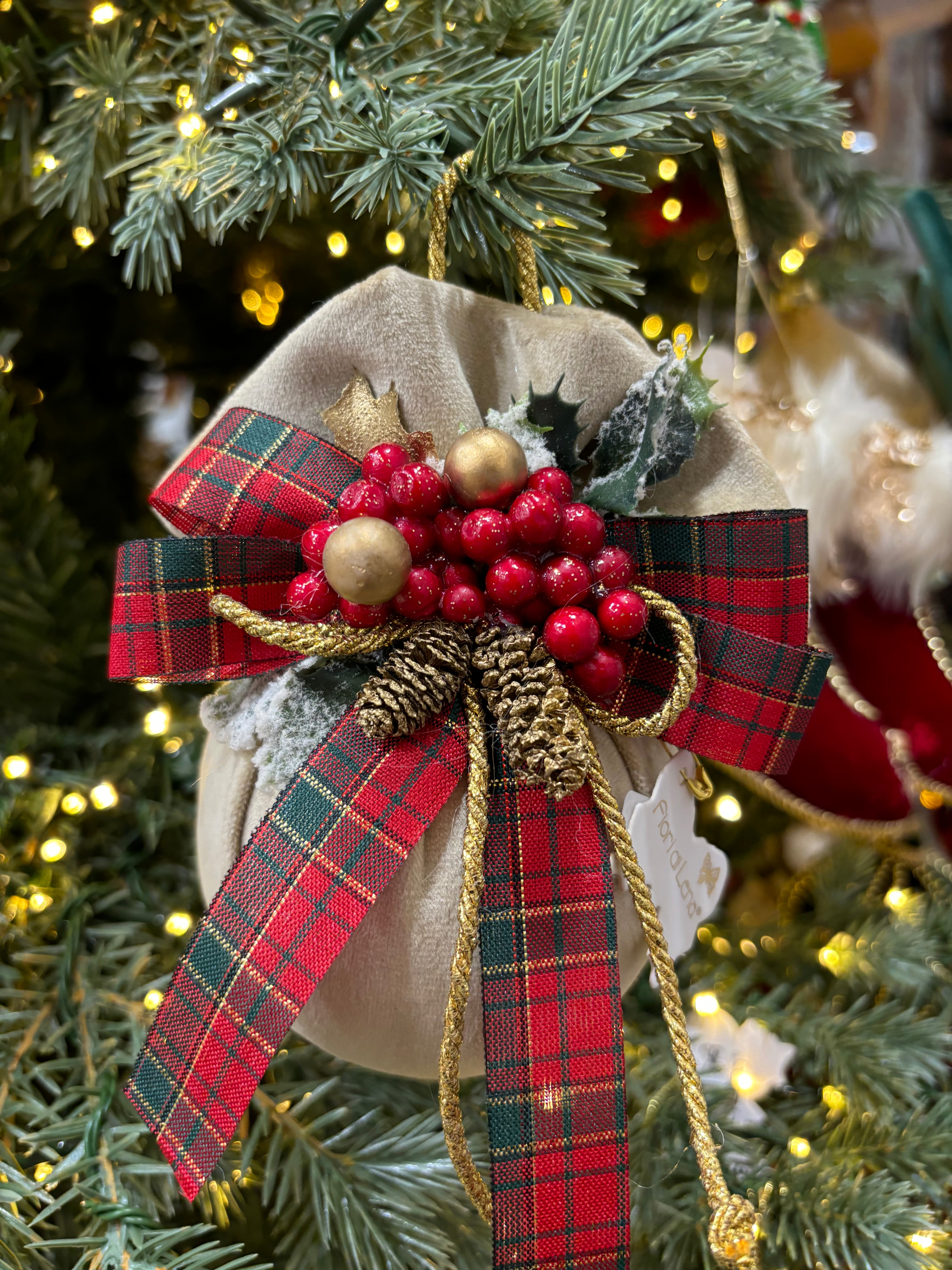 FIORI DI LENA SFERA DA APPENDERE IN VELLUTO NOCCIOLA E NASTRI TARTAN