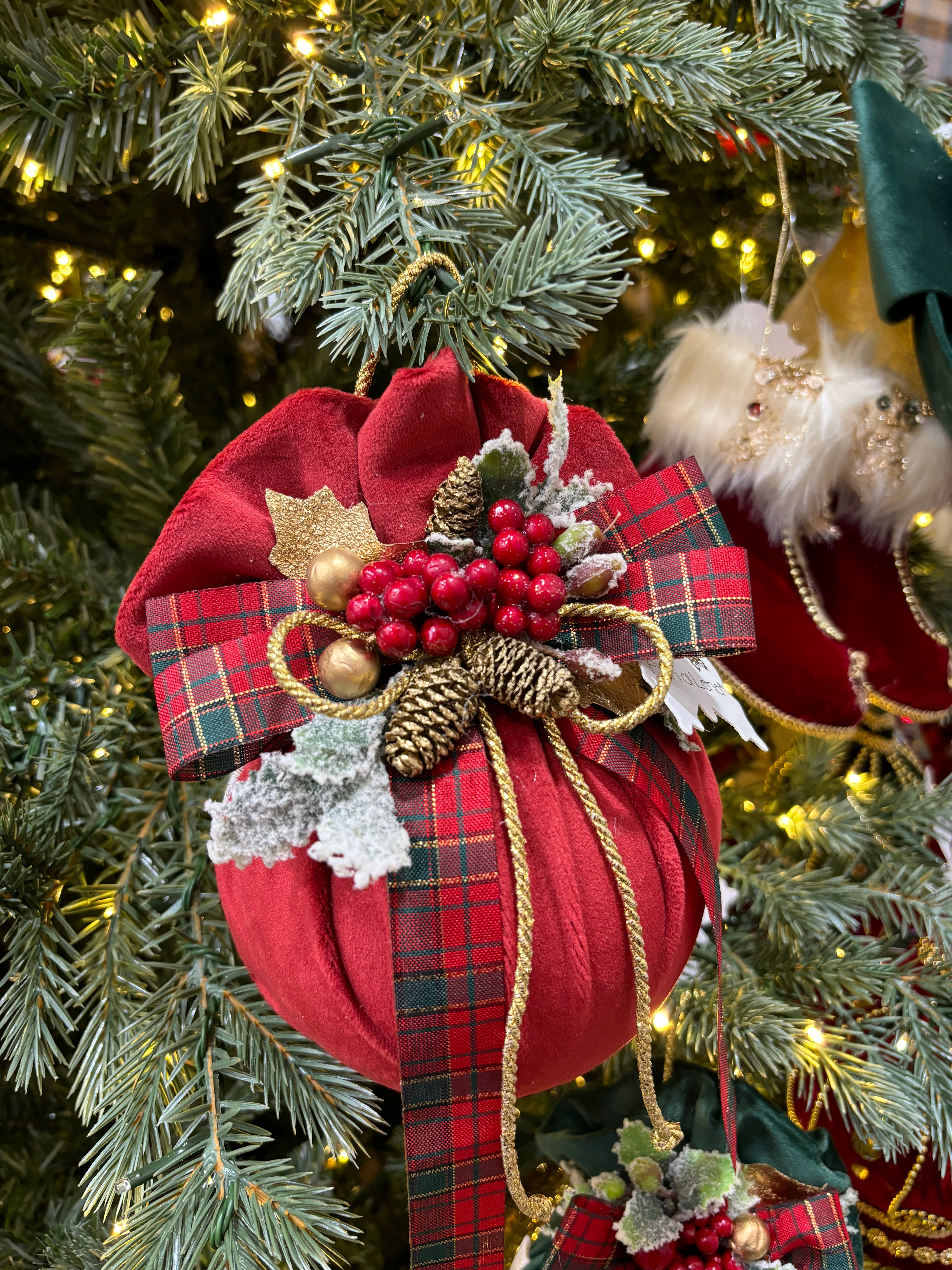 FIORI DI LENA SFERA DA APPENDERE IN VELLUTO ROSSO E NASTRI TARTAN